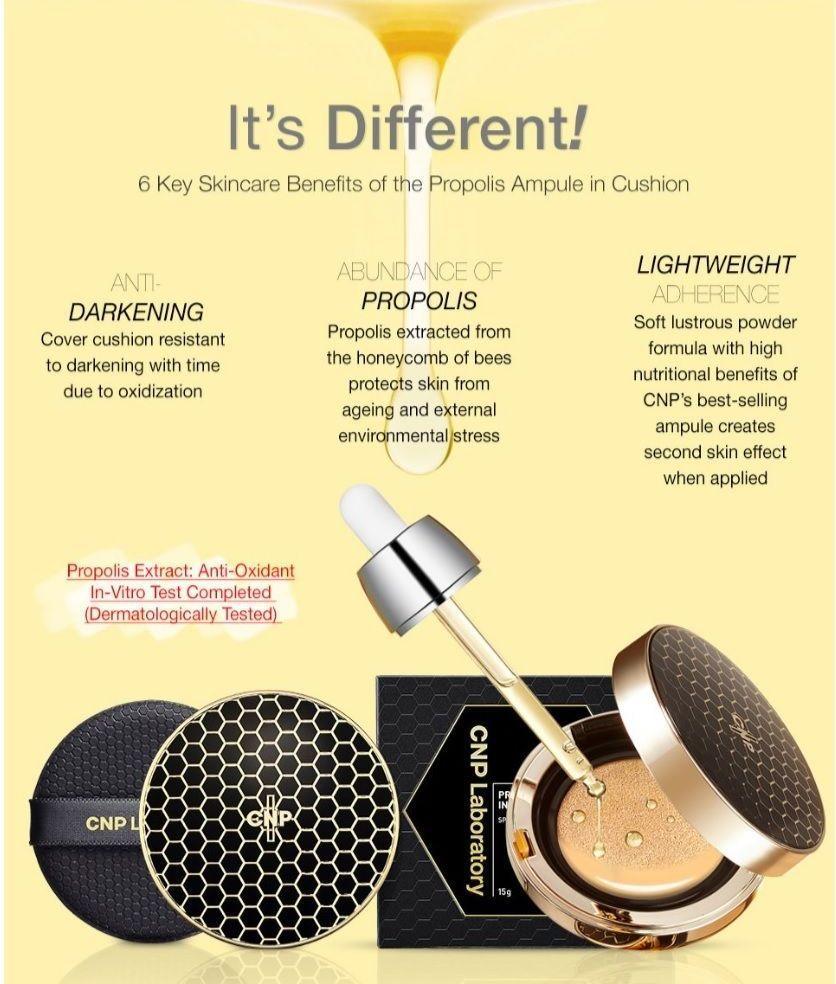 Non-oxidizing, long-lasting and full coverage cushion compact is formulated with propolis ampule, for a flawless look that is nourishing, lightweight and leaves skin radiant Propolis Ampule In Cushion is a medium to high coverage, moisturizing cushion enriched with Amazon Bee's Propolis Extracts. It invigorates the skin's energy with the same effect of an entire bottle of Propolis Energy Ampule being applied, and scatters the light of 99.9% of pure gold powder. CNP Laboratory Propolis Ampule In Cushion is a high-coverage, glowing cushion that adheres for long hours without darkening as if applying a full bottle of propolis ampoule. Propolis Ampule In Cushion supplies skin with vital energy resembling an entire bottle of propolis ampule while scattering the light of 99.9% pure gold to create natural, radiant skin with glossy shine Triple Cover Complex offers perfect coverage to create smooth, flawless skin express while Skin Fixer ingredient with coating powder presents excellent anti-darkening effect for long-lasting makeup Form moisture shield over skin to prevent moisture loss and keep supple, hydrated skin Soft powder content allows highly nourishing content to adhere on skin softly with a burdenless, lightweight texture