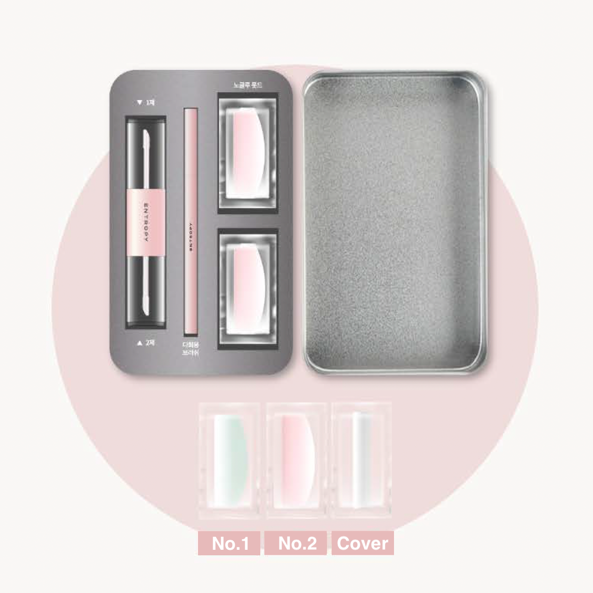 [Entropy Self Lash Perm] includes: - Dual-tip brush container with 1st agent (softener) + 2nd agent (penn solution) on both ends - 1st agent (softener dedicated) rods: 1 pair - 1st agent cap (used during softening): 1 pair - 2nd agent (penn solution dedicated) rods: 1 pair - Reusable brush for multiple applications This constitutes the DIV lash perm kit.