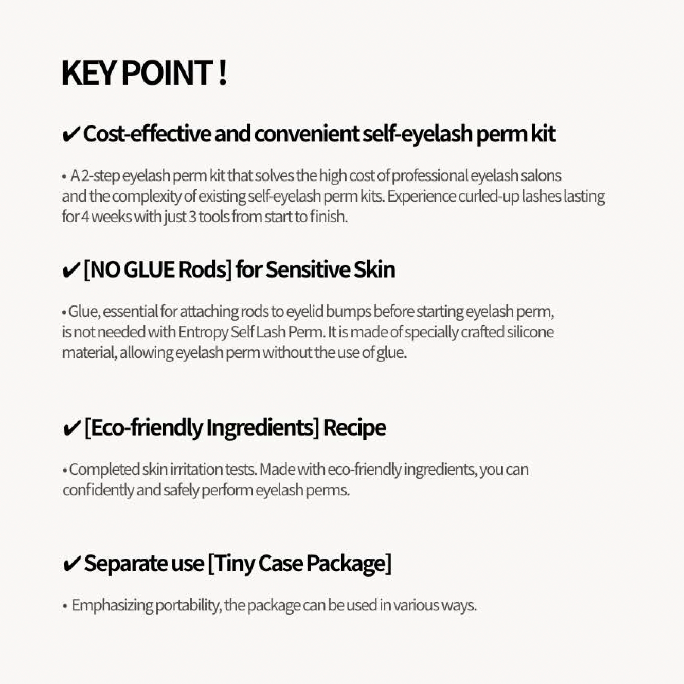 - Cost-effective and convenient self-eyelash pen kit: * A 2-step eyelash perm kit that solves the high cost of professional lash salons and the complexity of existing self-eyelash perm kits. Experience curled-up lashes lasting for 4 weeks with just 3 tools from start to finish. - [NO GLUE rods] for Sensitive Skin: * Glue, essential for attaching rods to eyelid bumps before starting eyelash perm, is not needed with Entropy Self Lash Perm. It is made of specially crafted silicone material, allowing eyelash perms without the use of glue. - [Eco-friendly Ingredients Recipe]: * Completed skin irritation tests. Made with eco-friendly ingredients, you can confidently and safely perform eyelash perms. - Separate use [Tiny Case Package]: * Emphasizing portability, the package can be used in various ways.