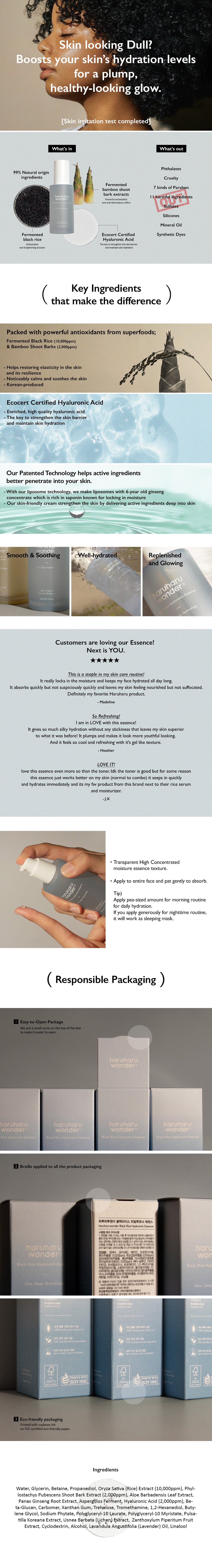 ? A refreshing essence formulated with 100% ferment extracts from Korea and highly concentrated Hyaluronic Acid that delivers rich moisture and nutrition to the skin with just a small amount. ? Features 10,000ppm Fermented Black Rice Extract that helps prevent the signs of aging by enhancing the skin elasticity with rich nourishment. ? Contains EWG Green Level ingredients including Betaine, Xanthan Gum for protecting the skin and Lavender Oil as a natural fragrance.
