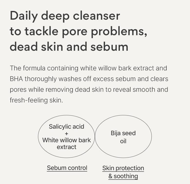 A refreshing cleansing foam that contains bija oil with skin protection and can be used comfortably on troubled skin. 1. Deep Cleansing Contains white willow bark extract and BHA to cleanse excess sebum and pores, and care for dead skin cells to create a smooth and fresh skin texture. 2. Cloud Texture The mousse-like, soft foam adheres to the skin and thoroughly cleanses impurities in the pores. 3. Mild Formula The formula that is gentle on the skin and can be used for acne and troubled skin.