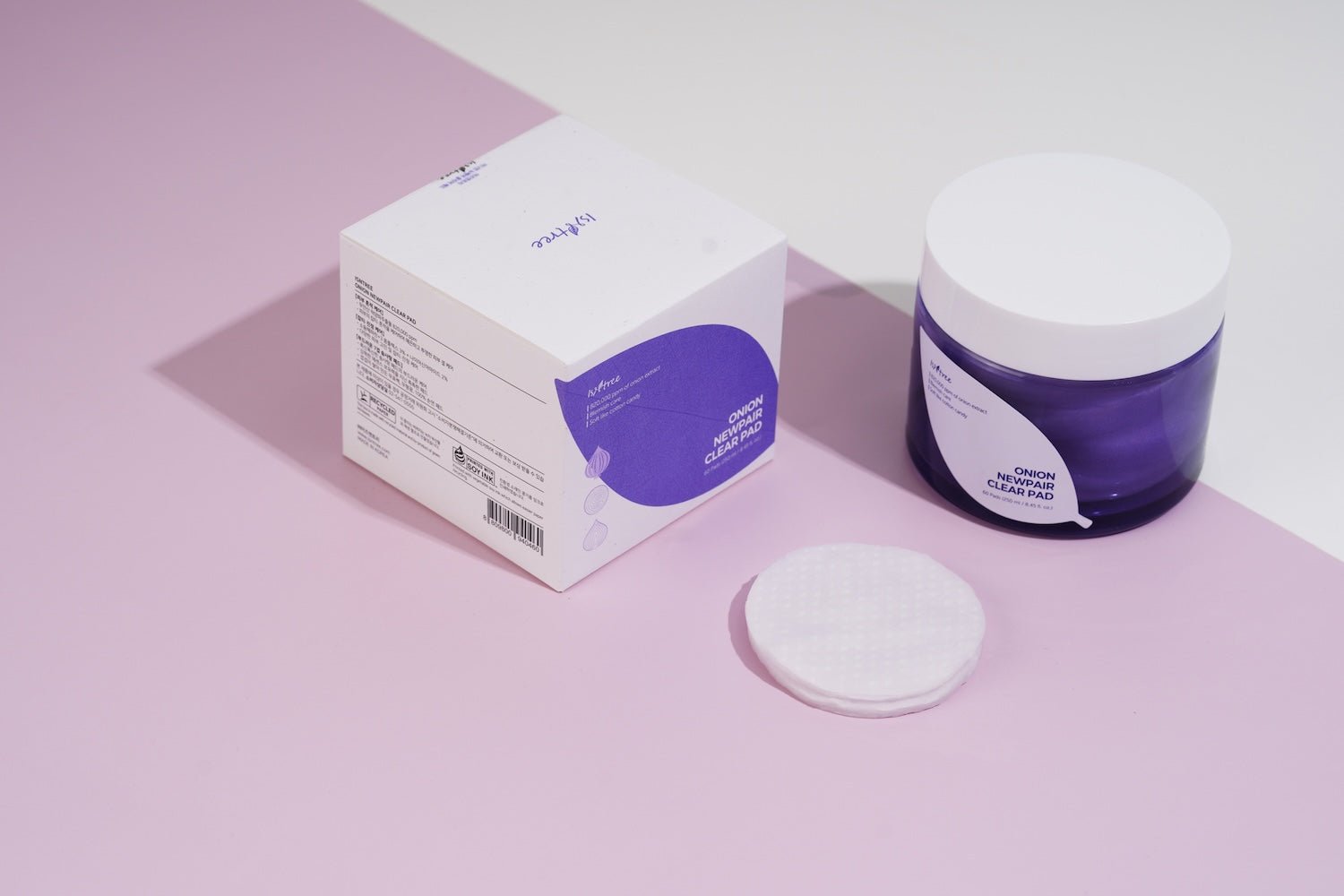 A toner pad containing allium cepa(onion) bulb extract and Sodium Heparin+3 Complex helps calm the skin and protect the skin barrier.