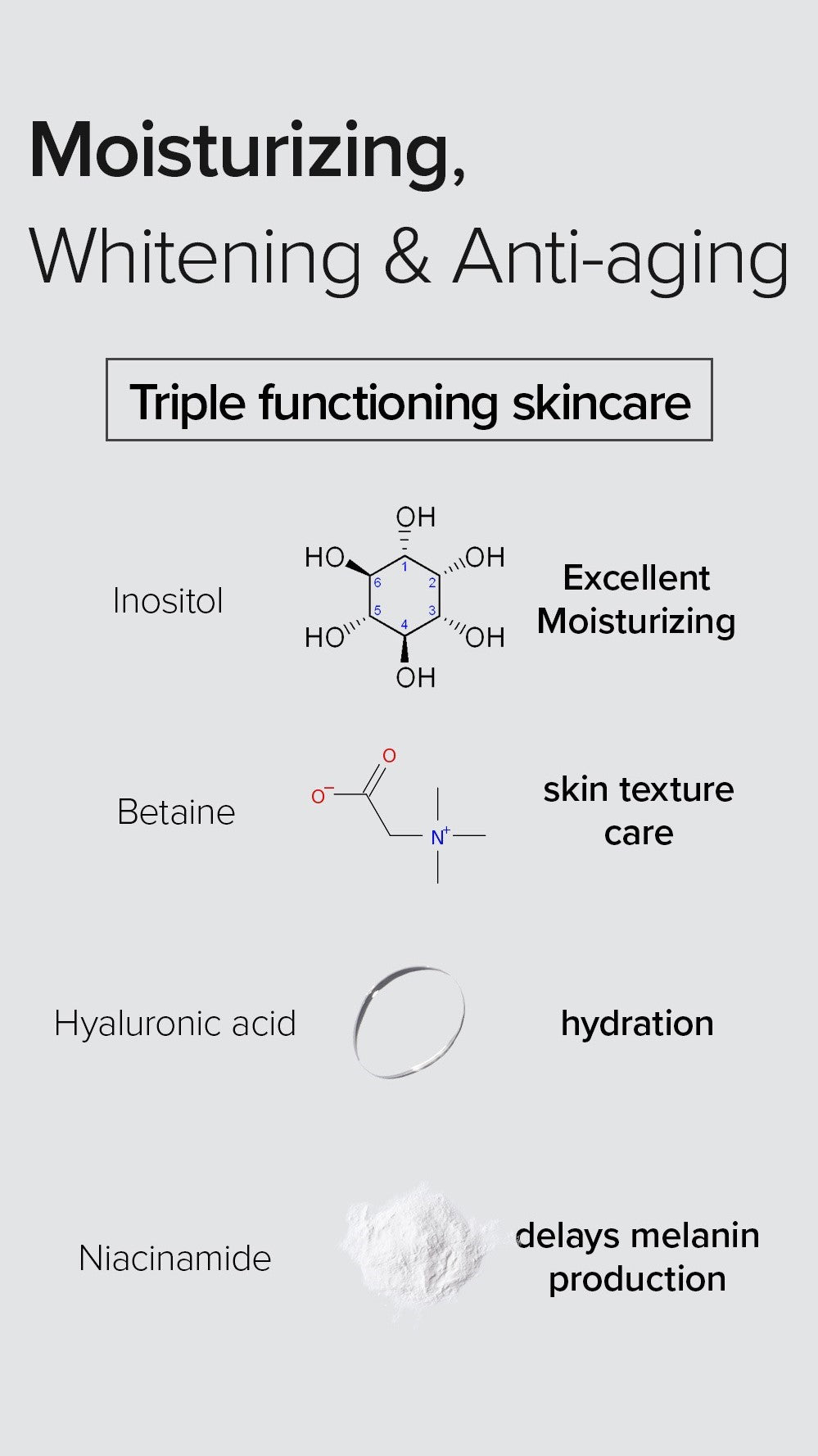 "SPF50+, PA+++ UVProtection/Whitening/Wrinkle improvement Triple function Sun screen " Contains 10,000ppm of F-CICA complex which have five cica ingredients, vitaminC and essential amino acid-rich fermented yeast, providing a strong calming effect on the skin Inositol ingredient removes melanin dust floating on the epidermis to even out the skin color, and takes care of the peripheral freckles to brighten the inside and outside of the skin. Contains betain, a natural amino acid moisturizer extracted from sugar radish, providing a strong moisturizing effect. Safe plant-derived white wood mushrooms-derived hyaluronic acid to provide a strong moisturizing effect and strengthen the moisture retention of skin cells by forming a moisture film on the skin. "Vegan certification completed All ingredients EWG green grade (excluding fragrance) Skin irritation test completed 16FREE Hazardous ingredients, Cruelty free, Eco-friendly packaging printed with soybean oil ink"