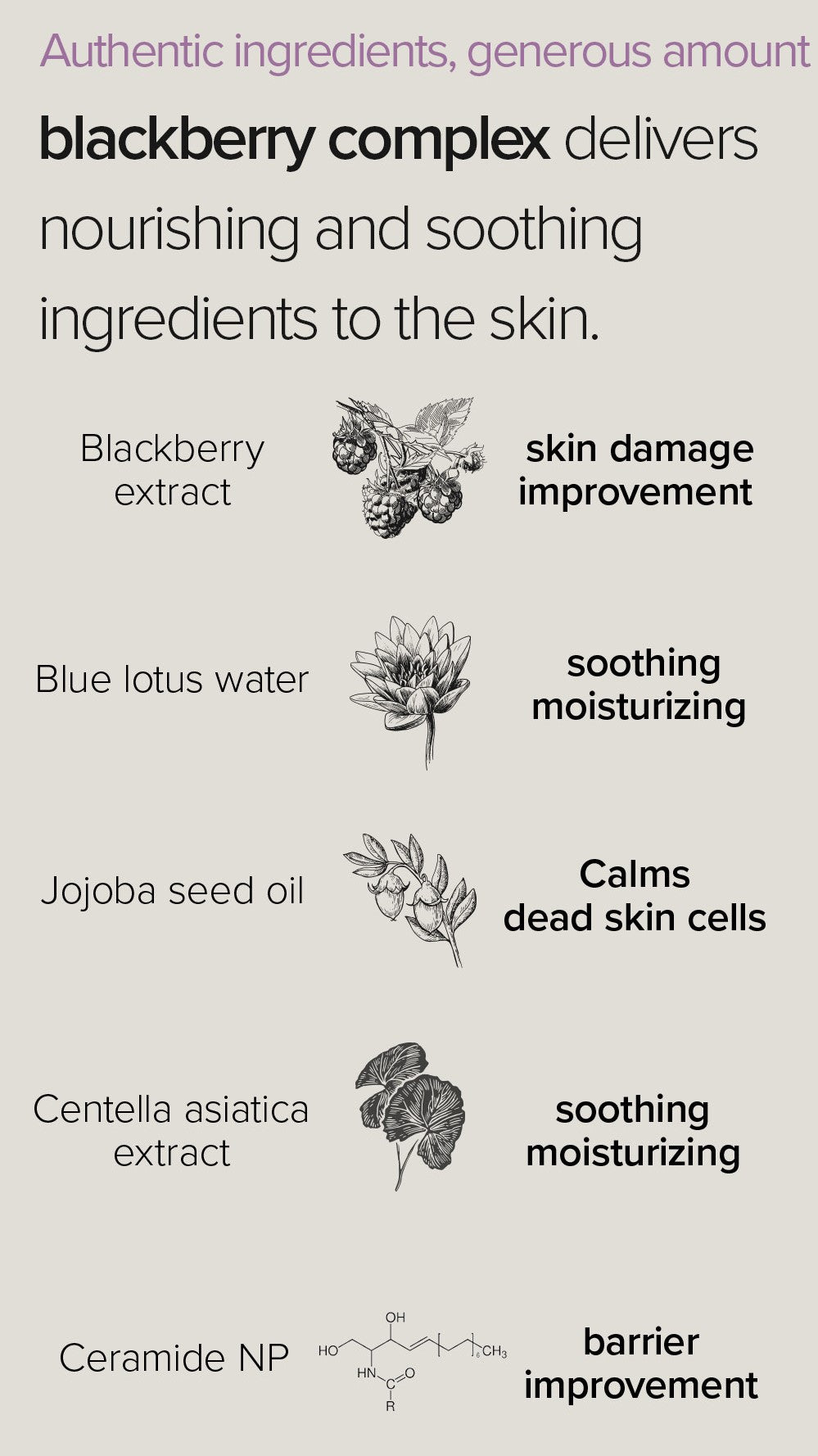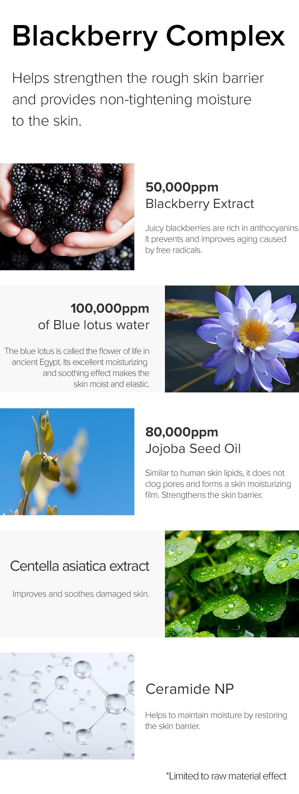 When the two layers are lightly shaken with Mary&May's special formulation Double Phase Emulsion technology, the high-viscosity cream dissolves in the moisturizing essence and stabilizes, and the concentrated nutrition is absorbed fresh and quick. Contains 50,000ppm of blackberry extract to delay agingand improve aging caused by free radicals With 100,000ppm blue lotus water, moisturizing and soothing effects, it provides moist and elastic skin. Jojoba seed oil and ceramide NP strengthen the rough skin barrier and provide non-drying moisture to the skin. A mild, fragrance-free, hypoallergenic essence, even for sensitive skin, provides the best moisturizing care for prickly skin. Vegan certification completed All ingredients EWG green grade (excluding fragrance) Skin irritation test completed 16FREE Hazardous ingredients, Cruelty free, Eco-friendly packaging printed with soybean oil ink