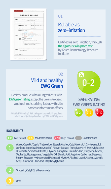 EWG Rating 1: Water, Caprylic/Capric Triglyceride, Stearyl Alcohol, Cetyl Alcohol, 1,2-Hexanediol, Lonicera Japonica (Honeysuckle) Flower Extract, Polyglyceryl-3 Methylglucose Distearate, Sorbitan Olivate, Glyceryl Caprylate, Palmitic Acid, Butylene Glycol, Ozokerite, Hydrogenated Vegetable Oil, Stearic Acid, Arginine, Carbomer, Beeswax, Stearyl Stearate, Hydrogenated Palm Acid, Myristyl Alcohol, Lauryl Alcohol, Myristic Acid, Lauric Acid, Oleic Acid, Ethylhexylglycerin EWG Rating 2: Glycerin, Cetyl Ethylhexanoate EWG Rating 3: Urea