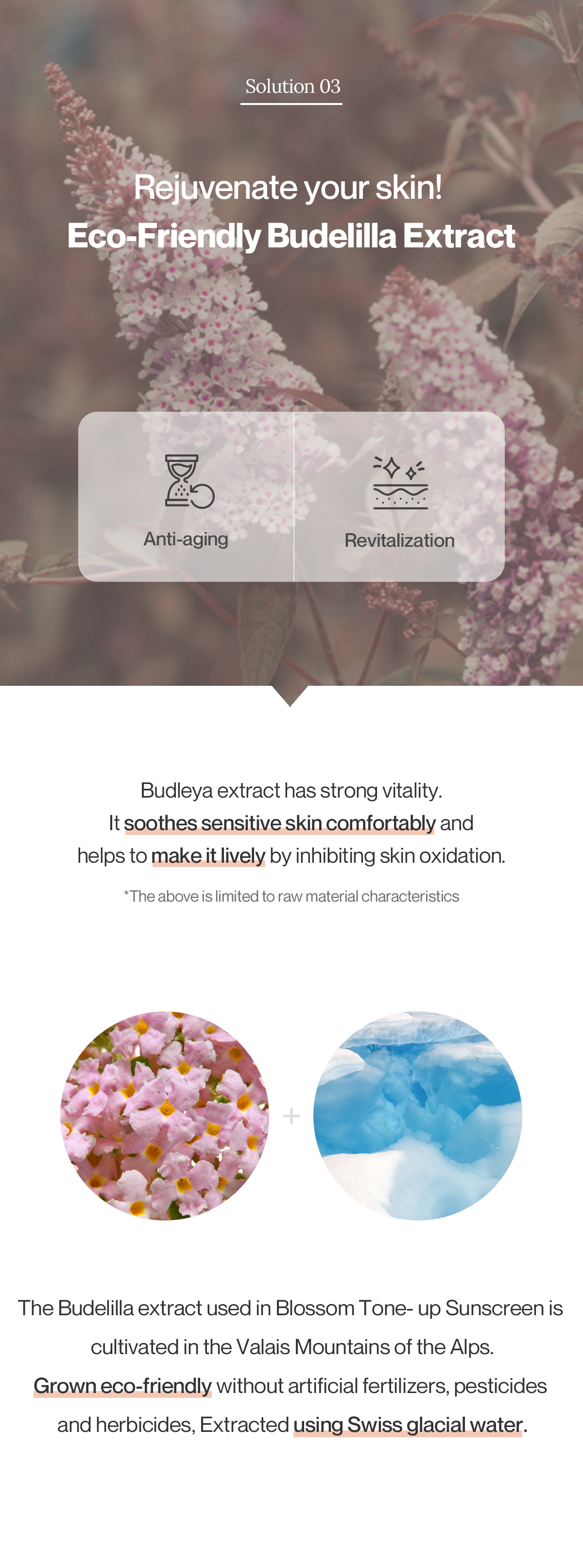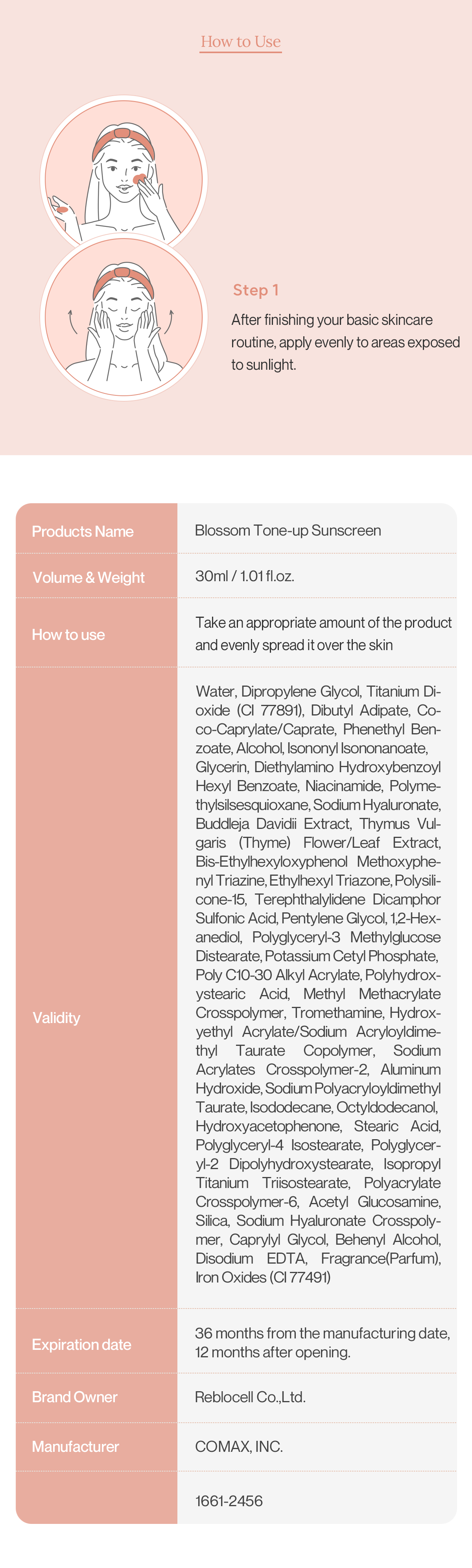 Keep the moisture in and UV out of your skin. ? SPF50+ PA++++ Sunscreen with an acacia-derived peptide [sunblock function] ? Get refreshed with hydro peptide ?Disposable pocket type, easy to take out with A natural and bright tone-up that seems tailored to the skin. A natural pearly tone-up for all skin tones Even for light outings, as a makeup base. A natural and bright pearly tone-up sunscreen A natural and bright tone-up that seems tailored to the skin The satisfaction rate for tone-up is 99.3% Solution 1 smoothly, But finishes refreshingly A smooth aplication with an organic-inorganic hybrid formula Quickly and brightly, on every busy mornings. Just the amount you need, pop it! With an easy-to-use adjustable outlet Quickly and conveniently Even when spread quickly by hand, it is evenly applied without clumping. Skin texture and natural tone correction. it's easy to use as a makeup base Solution 3 Rejuvenate your skin! Eco-Friendly Budelilla Extract Budleya extract has strong vitality. It soothes sensitive skin comfortably and helps to make it lively by inhibiting skin oxidation The Budelilla extract used in Blossom Tone-up Sunscreen is cultivated in the valais mountains of the Alps. Grown eco-friendly without artificial fertilizers, pesticides and herbicides, Extracted using Swiss glacial water. A natural and bright skin solution. Blossom Tone-up Sunscreen - No white cast, a natural tone-up without excess. - A moist and smooth application sensation - A makeup base that provides a refreshing and well-groomed skin. - Budelilla extract using Swiss glacial water Brightening functional cosmetics We have received brightening functionality certification from the Food and Drug Safety Agency. Let's take care of your skin to make it bright and radiant with Blossom Tone-up Sunscreen Sustainable Beauty by Reblocell REEF-SAFE sunscreen We use ingredients that do not harm coral reefs French EVE vegan certification Limit the use of animal ingredients and prohibit animal testing Hypoallergenic test completed Hypeallergenic test completed for safe sue on sensitive skin. Free from harmful ingredients This product is free from 20 types of harmful ingredients, excluding Tu02, according to EWG Green