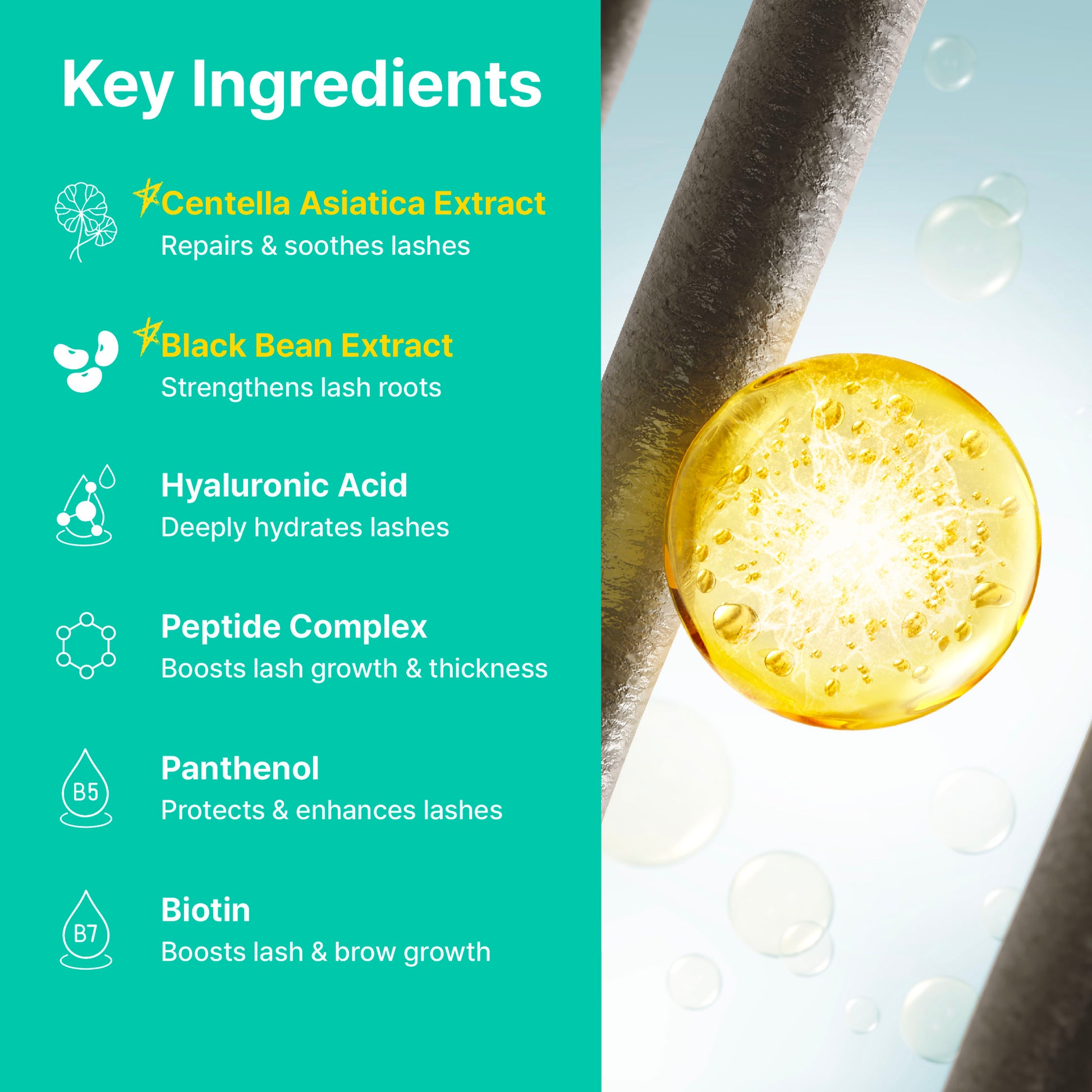 Hyaluronic Acid ? Hydrates and locks in moisture Peptides ? Encourages fuller, thicker lashes and brows Biotin ? Strengthens hair at the root Centella Asiatica Extract ? Calms and repairs delicate skin