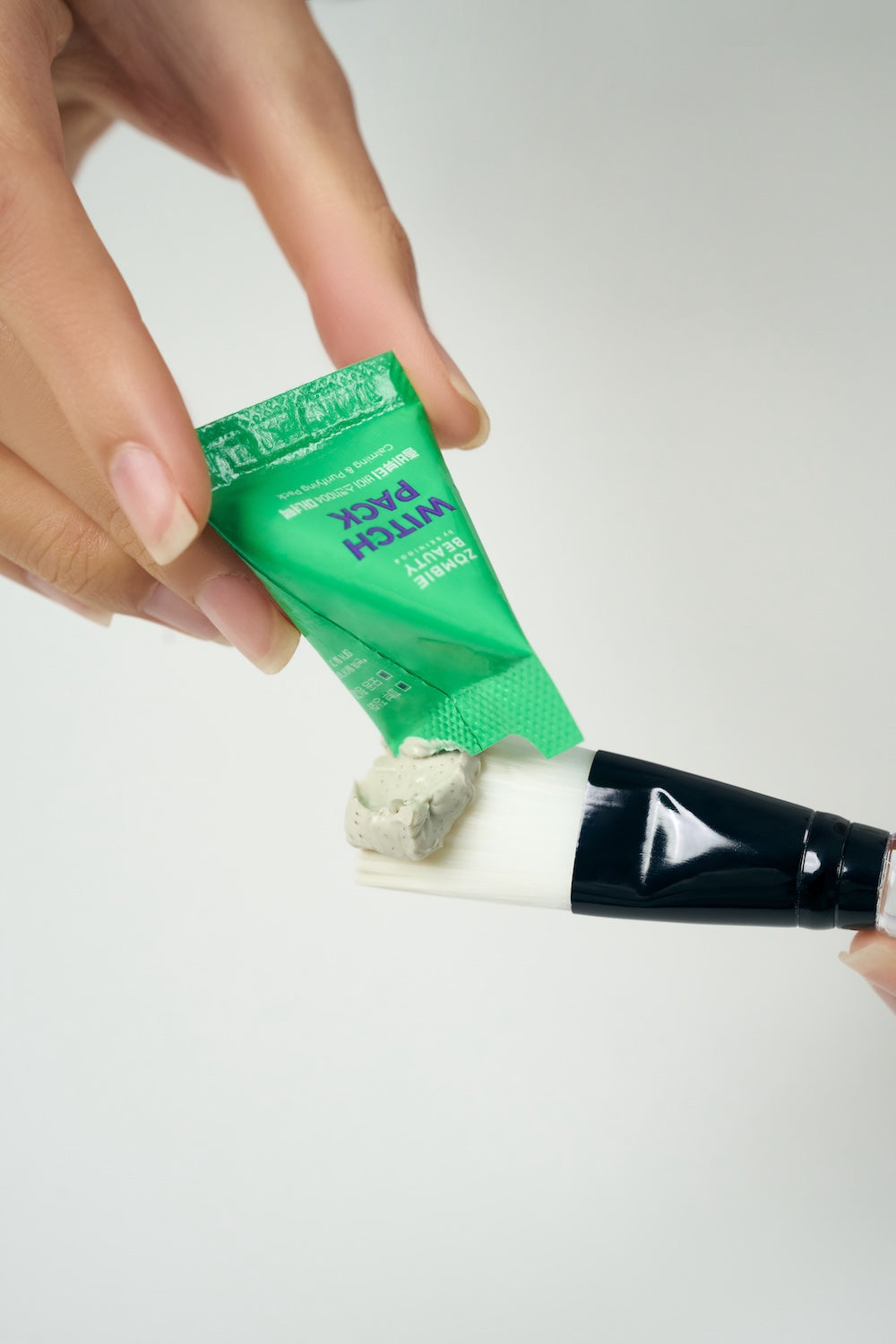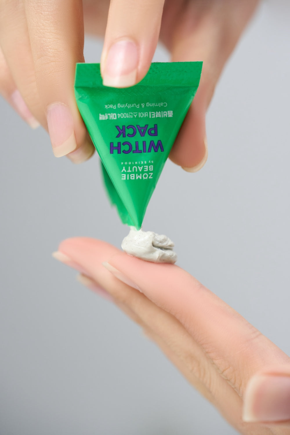 1. After opening Witch Pack, apply the mud pack with a brush or by hand. 2. Apply evenly all of your face except the areas around eyes and mouth. 3. After 5-10 minutes, rinse thoroughly with lukewarm water.