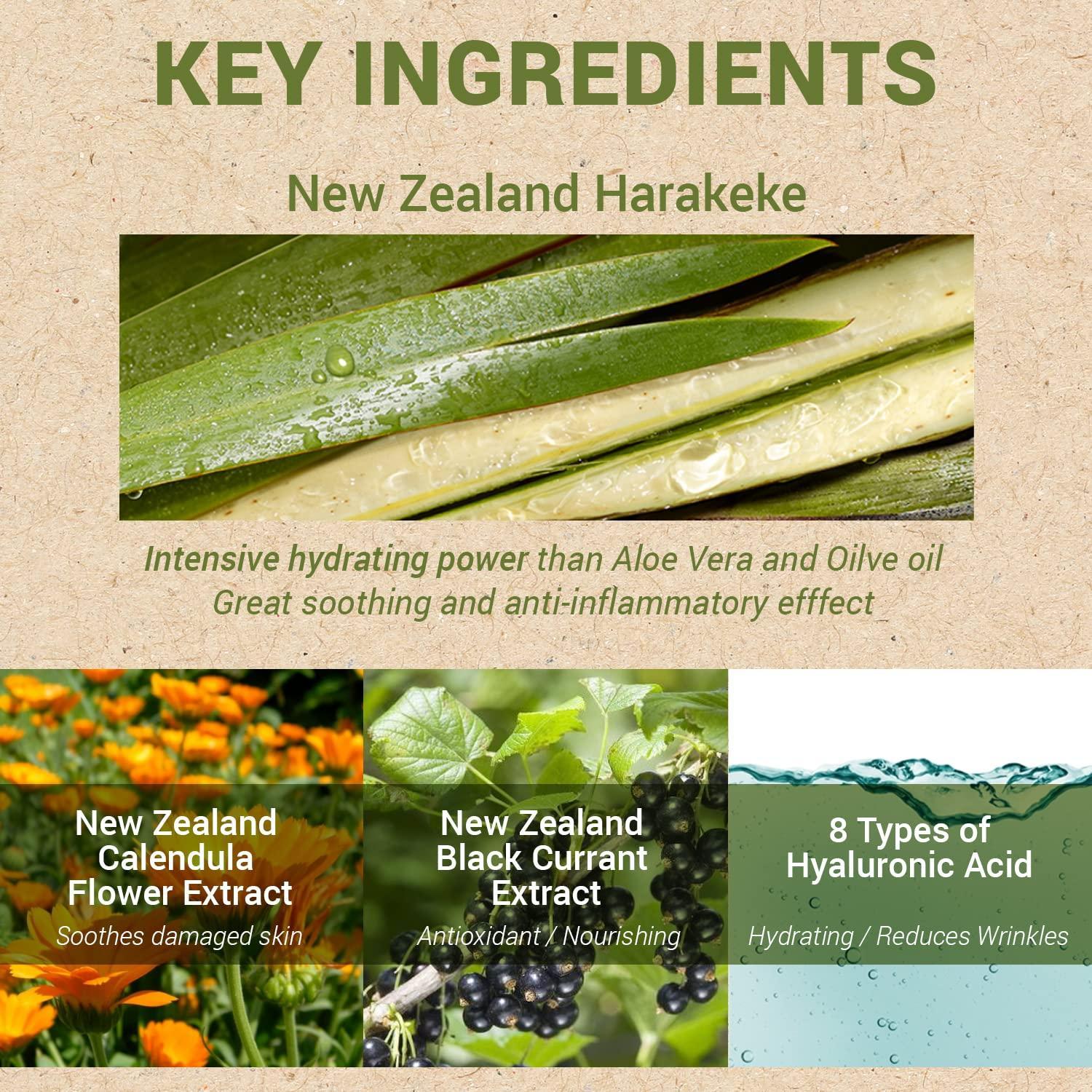 Fresh cream with a hydrating gel formula that smoothly spreads over the skin, maintaining a moisturized and supple skin texture Contains Harakeke Extract, New Zealand's Natural Moisturizer - Harakeke extract delivers rich moisture to dry skin and helps retain moisture that is easily lost between skin textures Contains 8 Types of Hyaluronic Acid 8 different types of hyaluronic acid deeply hydrate the skin and form a moist barrier, creatng a supple skin texture Refreshing gel-type fresh cream full of moisutre - A refreshing gel cream brimming with moisture that hydrates the skin and leaves a non-sticky, invigorating finish